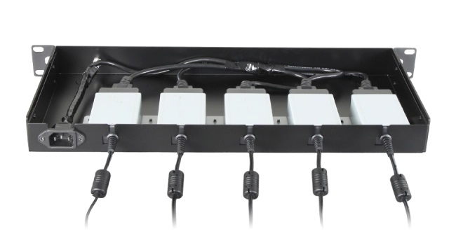 Передняя панель имеет индикатор питания, а задняя панель имеет один входной разъем переменного тока и 5 выходных разъемов постоянного тока. Кроме того, есть кронштейн, который вмещает 5 блоков питания, и предусмотрены винты для крепления кронштейна к нижней части корпуса сбора.