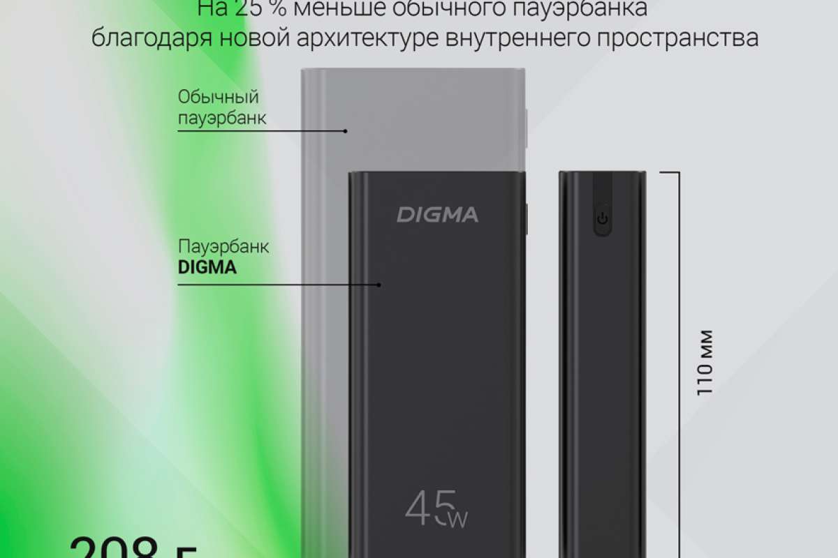 Модель Digma DGPF10E – компактное и мощное устройство, способное заряжать не только мобильные гаджеты, но и ноутбуки, благодаря поддержке Power Delivery 45 Вт.