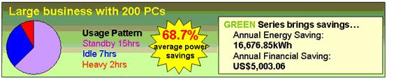 Большие предприятия с 200 ПК смогут сэкономить немало средств благодаря технологии серии GREEN. При стоимости одного кВт.ч $0.30 с учетом, что 15 часов компьютеры находятся в режиме ожидания/выключены, 7 часов в режиме бездеятельности и 2 часа в режиме тяжелой нагрузки (в среднем), среднегодовая экономия средств составляет 5000 долл. США.