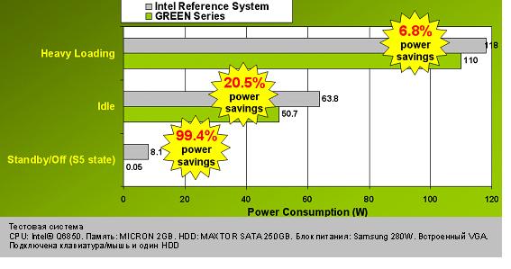 Тесты, проведенные в лаборатории FOXCONN и продемонстрированные на CeBIT 2008, показали характерную экономии энергии в 68%* для офисного ПК, когда система в течение суток большую часть времени находится в режиме ожидания или выключена или по большей части имеет небольшую нагрузку при периодическом ее увеличении. Для семейного домашнего ПК экономия энергии еще больше – около 85%*, когда ПК в основном находится в режиме ожидания и выключен.