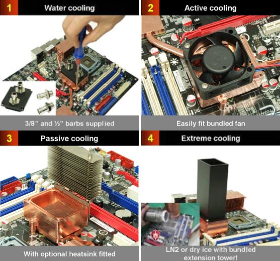 Кулер 4в1 Quantum состоит из цельномедных тепловых трубок для NB-SB-VRM; с помощью идущих в комплекте аксессуаров часть кулера для северного моста можно быстро настроить на пассивное или активное охлаждение воздуха, водяное охлаждение и даже экстремальное охлаждение LN2 или сухим льдом!
