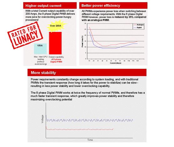 8-фазный цифровой PWM обеспечивает более высокую подачу питания, отвечая требованиям энтузиастов и оверклокеров. У инженеров Quantum Force ушло 3 месяца на тонкую настройку и оптимизацию этой цифровой системы, чтобы она работала с более высоким КПД, быстрее и стабильней реагировала на изменения в потреблении энергии и обеспечивала более высокий ток на выходе для экстремального разгона.