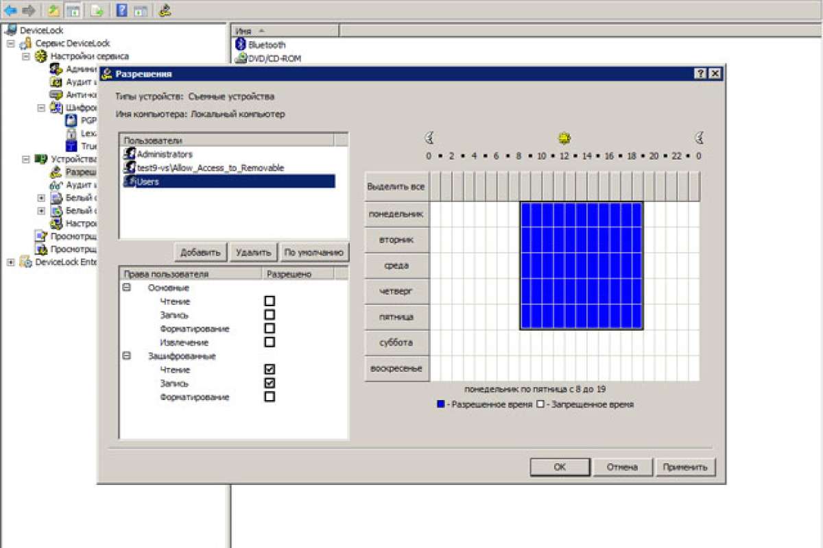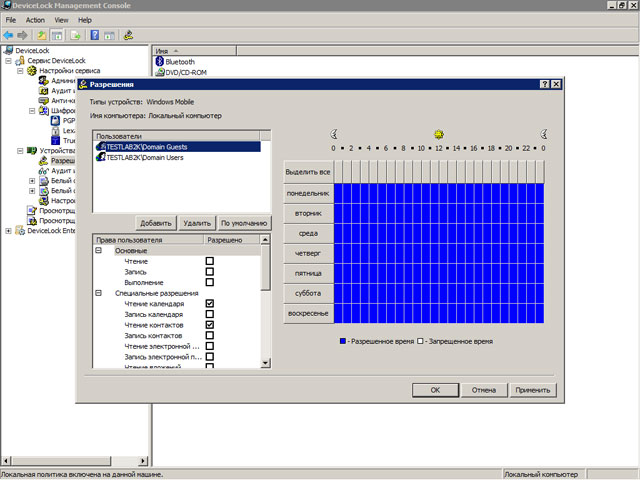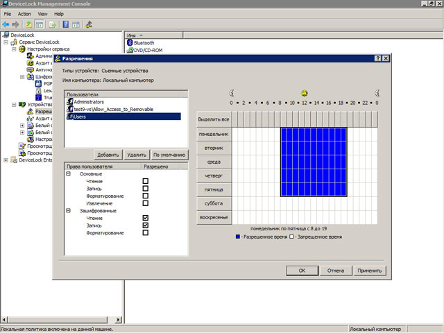 - Контролировать доступ пользователей и групп к устройствам и портам ввода-вывода в зависимости от времени и дня недели.