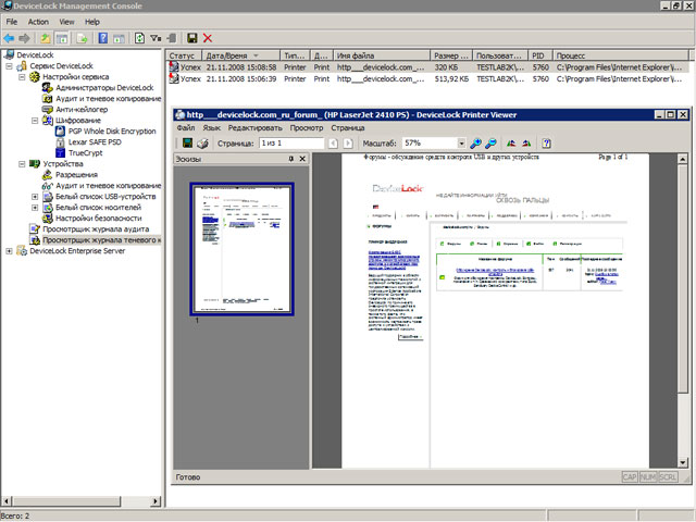 - Для каждого пользователя или группы сохранять точную копию данных (теневое копирование), копируемых на внешние устройства, передаваемых через последовательные и параллельные порты, а также печатаемых на локальных и сетевых принтерах. Точные копии всех файлов и данных сохраняются в SQL-базе данных на сервере.