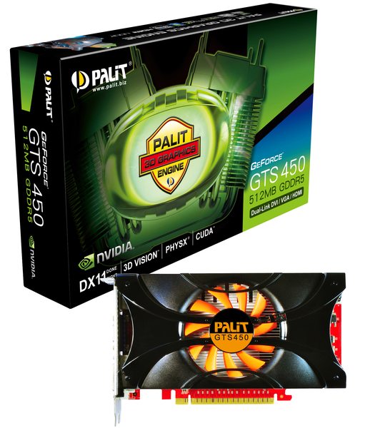 У видеокарт Palit GTS 450 есть все, чтобы завладеть вашим вниманием, включая новейшие технологии NVIDIA 3D Vision, NVIDIA Surround и PhysX. Линейка GTS 450 стала еще доступнее, ведь рекомендованная розничная цена Palit GTS 450 512MB составляет всего $109. Новинка скоро появится в продаже.
