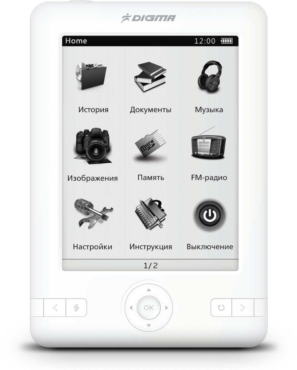 Обе читалки – Digma e500 и Digma e501 – практически идентичны по своим возможностям. Тем не менее, есть весьма принципиальное отличие, – это наличие высококачественного экрана E-Ink Pearl в новой модели e501. Кроме этого, как и в предыдущей модели, управление ридером можно осуществлять при помощи центрального джойстика и механических кнопок на фронтальной панели. Также вы можете установить индивидуальные настройки: изменить тип шрифта, его размер, отмасштабировать текст и изображения, прослушать музыку в фоновом режиме. Читалка Digma e501 – это классический компактный ридер с высококачественным экраном, поддержкой большинства популярных форматов для чтения, возможностью просмотра изображений, FM-радио. Кроме этого Digma e501 – это максимально простая навигация, благодаря которой читать и работать с устройством комфортно и приятно.