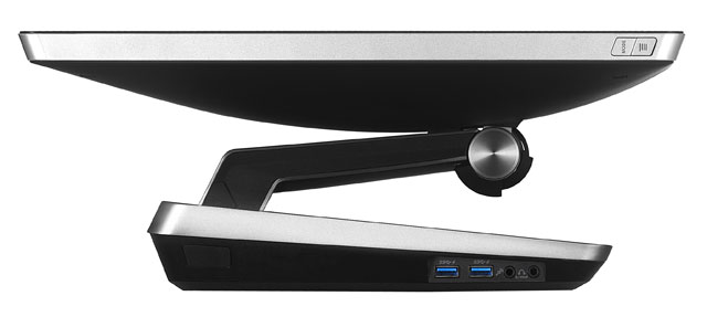 Главная отличительная черта ASUS ET2300 — характерный узел крепления монитора к надёжному устойчивому основанию, в котором, собственно, и расположилась вычислительная начинка. Двухшарнирный крепёж позволяет не просто наклонять экран на самые различные углы относительно поперечной горизонтальной оси, но и разворачивать его параллельно плоскости стола, на которой стоит моноблок.