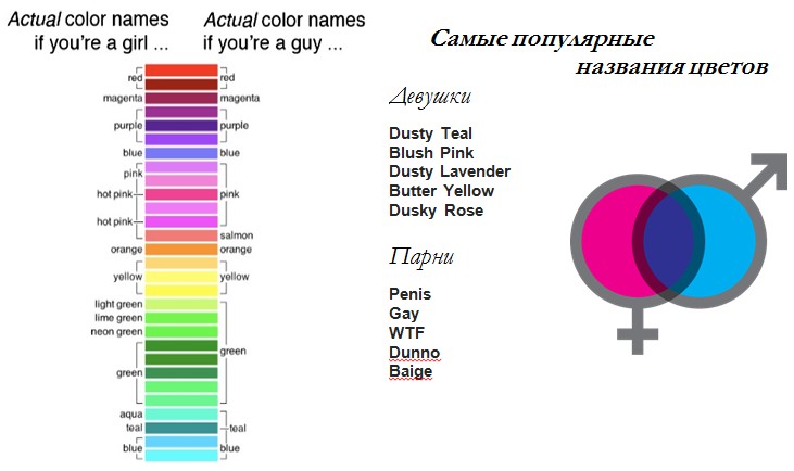 Забавное исследование провел молодой физик НАСА, известный также своим саркастически-романтическим комиксом xkcd. Он выяснил, как называют цвета мужчины и женщины, а также попросил голосовавших (а их было более двухсот тысяч) придумать называния цветам и вот что получилось! Без комментариев!