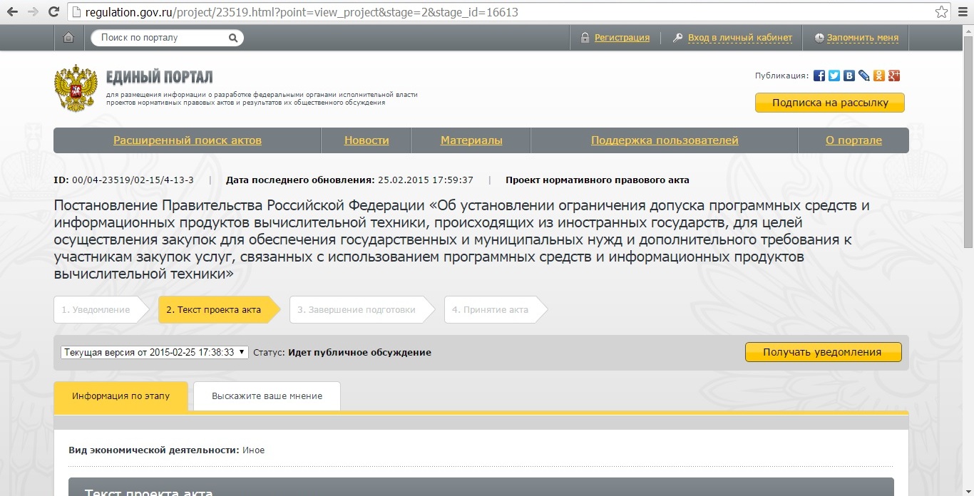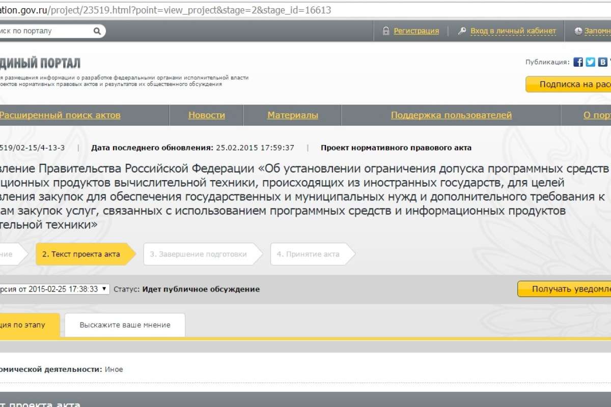 Многочисленные разговоры по поводу ИТ-импортозамещения, идущие с начала лета прошлого года, получили некоторое продолжение: Минкомсвязи на Едином портале для размещения информации о разработке федеральными органами исполнительной власти проектов нормативных актов и результатов их общественного обсуждения опубликовало проект постановления правительства РФ «Об установлении ограничения допуска программных средств и информационных продуктов вычислительной техники, происходящих из иностранных государств, для целей осуществления закупок для обеспечения государственных и муниципальных нужд и дополнительного требования к участникам закупок услуг, связанных с использованием программных средств и информационных продуктов вычислительной техники».