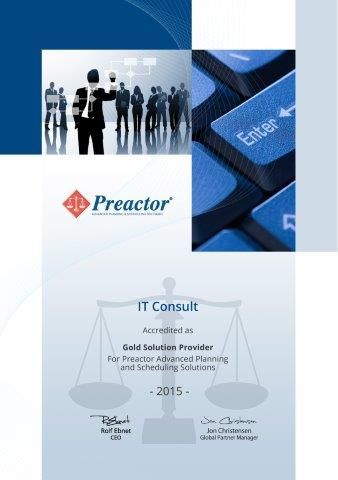 Компания АйтиКонсалт стала единственной в России обладательницей наивысшего в мире партнерского статуса Gold Solution Provider от компании Preactor International Ltd — A Siemens Company, мирового лидера в производстве систем и приложений, рассчитанных на решение задач как долговременного, так и краткосрочного календарного планирования.