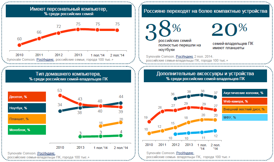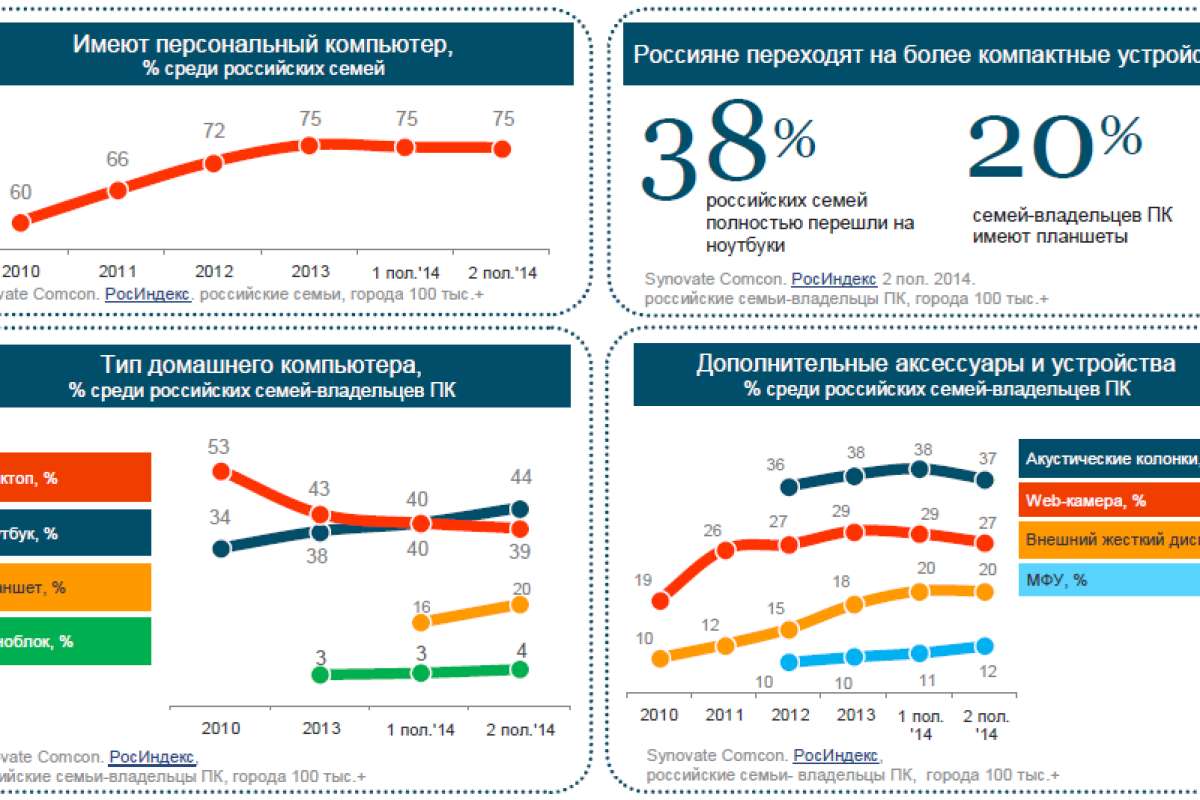 При этом общий тренд пользования домашними компьютерами в России перестал расти. По итогам 2-ой половины 2014 они есть у 75% семей, живущих в городах с населением 100 тыс. чел. и более. Отказ от компьютера характерен для семей, состоящих из пенсионеров или людей старшего возраста, живущих без детей, семей из небольших городов (с населением до 500 тыс. чел.), а также для домохозяйств с низким социально-экономическим статусом.