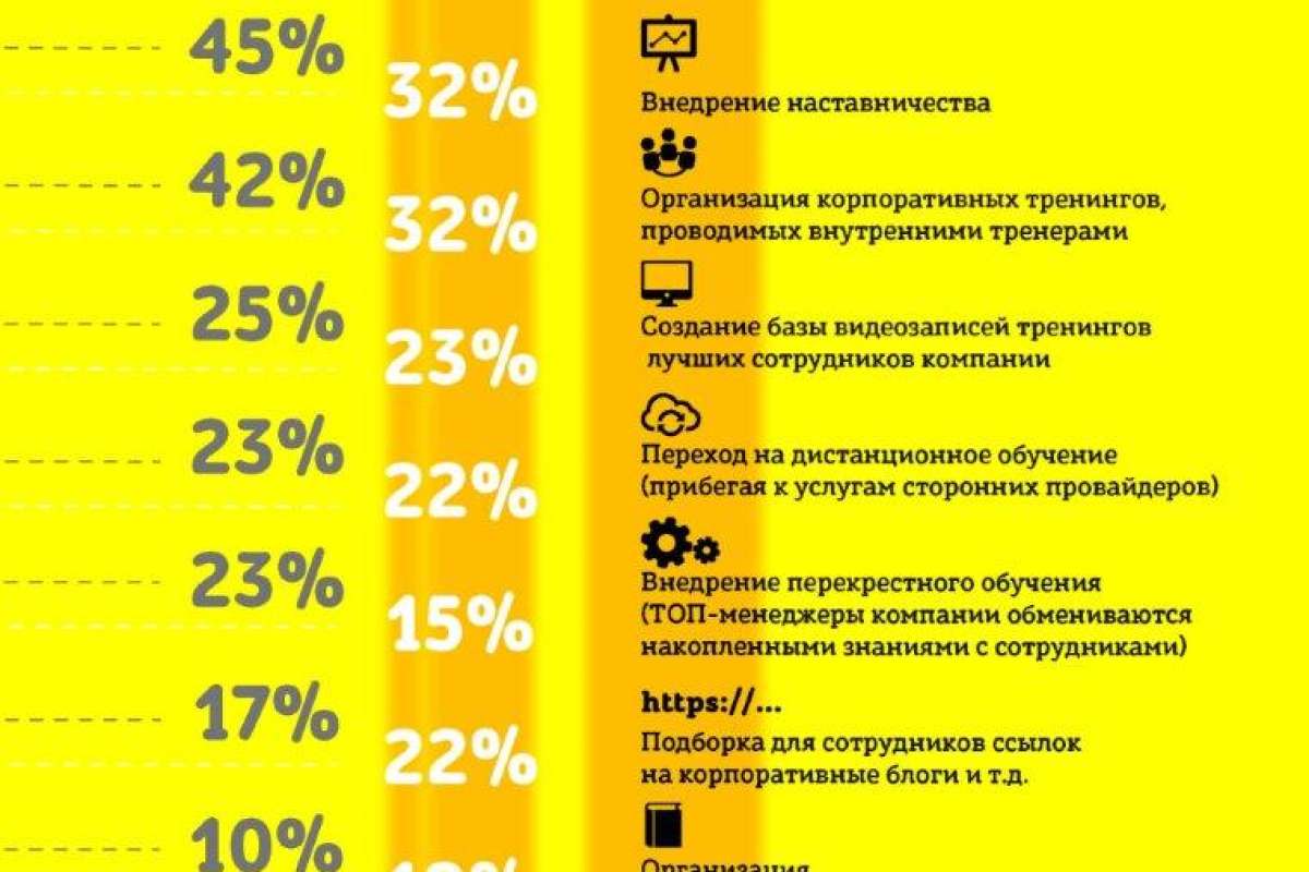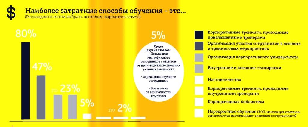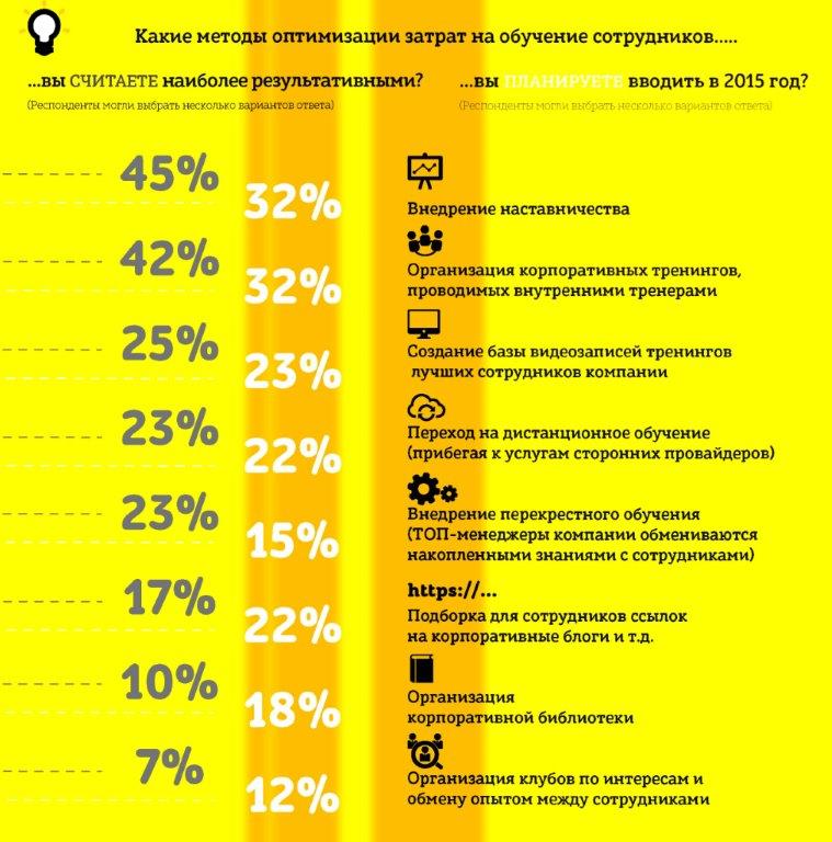 Сообщается, что подавляющее большинство респондентов данного исследования (83%) согласны с мнением о том, что образование сотрудников — главный инструмент повышения профессионального уровня, мотивации и лояльности персонала. При этом наиболее результативными методами оптимизации затрат на обучение персонала респонденты считают внедрение наставничества (это отметили 45% участников опроса, при этом только 32% из них планируют использовать данный метод обучения в условиях кризисного времени); организацию корпоративных тренингов, проводимых внутренними тренерами (42%); создание базы видеозаписей тренингов (25%). Кроме того 23% опрошенных считают эффективным переход на дистанционное обучение (прибегая к услугам сторонних провайдеров).