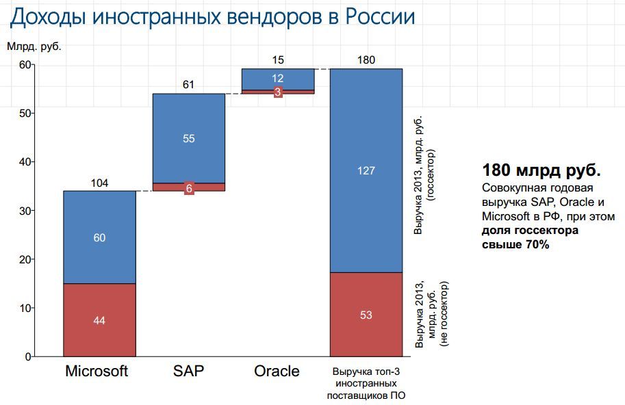 На круглом столе «Госзакупки: механизмы стимулирования импортозамещения», проходившем 10 июля в рамках международной промышленной выставки «ИННОПРОМ-2015», заместитель генерального директора компании Cognitive Technologies Максим Чернышев обозначил объем финансовых потерь государства от работы западного ПО на территории России. По его словам, ежегодные бюджетные траты на продукты трех крупнейших поставщиков (SAP, Oracle и Microsoft) составляют 180 млрд. рублей, в то время как систематическое внедрение отечественных ИТ-решений ежегодно сохраняло бы в казне государства свыше 500 млрд. рублей.