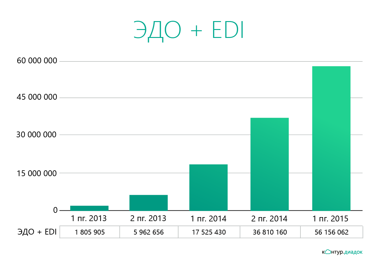 Данные двух первых кварталов 2015 года позволяют сделать уточненный прогноз на весь год. По прогнозу Эдуарда Шифмана, через систему Диадок в 2015 году пройдет более 50 млн юридически значимых документов. В целом за год через системы компании СКБ Контур в рамках межкорпоративного обмена документами, включая EDI-сообщения, должно пройти более 150 млн сообщений.