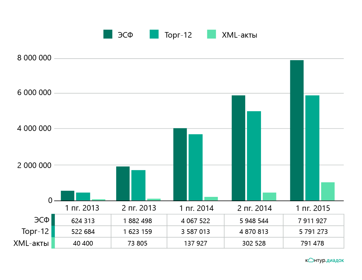 Такой прогноз озвучил оператор электронного документооборота СКБ КонтурВсего через системы компании СКБ Контур за первое полугодие 2015 года передано 56,1 млн электронных сообщений (не считая отчетности в контролирующие органы). Из них 37,6 млн EDI-сообщений и 18,5 млн электронных юридически значимых документов. В числе последних — 7,9 млн электронных счетов-фактур (43 %), 5,8 млн электронных ТОРГ-12 (31 %), 0,8 млн формализованных актов (4 %) и 0,18 млн неформализованных актов (1 %). В целом доля формализованных документов в формате, определенном ФНС, составляет 78 %.