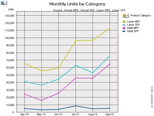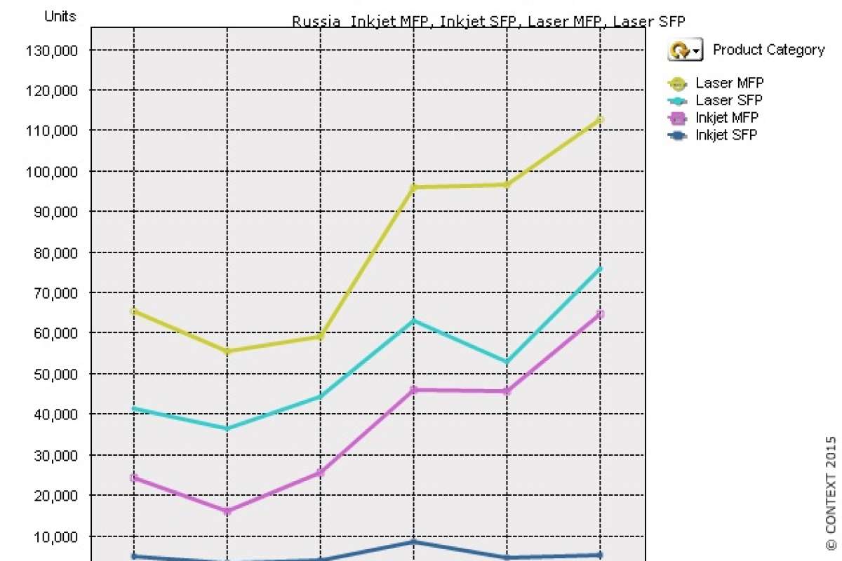 CONTEXT объявляет итоги III квартала 2015 г. на российском рынке устройств печати. По данным аналитической компании, с июля по сентябрь 2015 г. были проданы 305 389 лазерных МФУ, 191 839 лазерных принтеров, 156 666 струйных МФУ и 18 558 струйных принтеров.