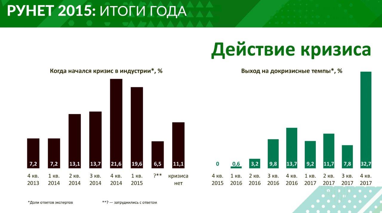 Понятно, что снижение динамики темпов роста даже самых успешных рынков Интернет-отрасли обусловлено влиянием кризиса. По мнению экспертов, опрошенных РАЭК (результаты этого опроса приведены на диагр. 4), выход Интернет отрасли на докризисные темпы развития ожидается лишь в IV квартале 2017 г. Но есть и более оптимистичные оценки.