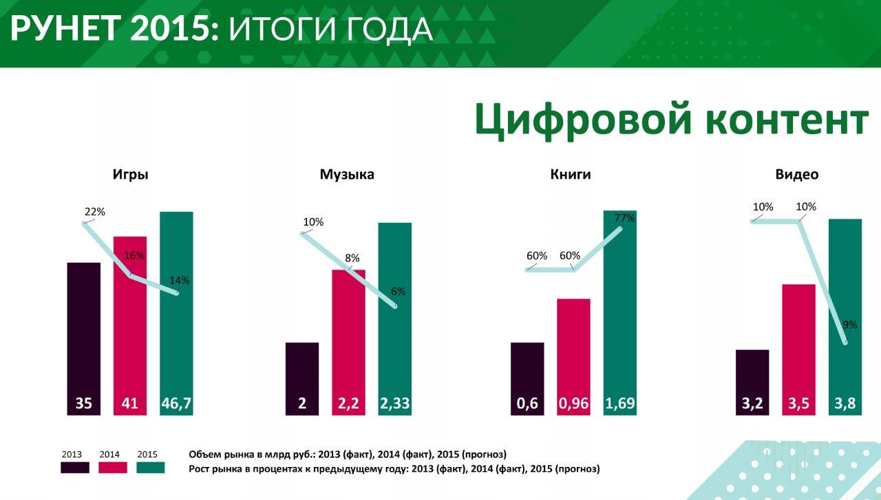 Если говорить о конкретных сегментах Интернет-отрасли, то, по оценкам РАЭК, в нашей стране активнее всего растут онлайн-продажи электронных книг. Предполагается (см. диагр. 2), что в этом году объем данного рынка достигнет 1,69 млрд. руб. Что на 77% лучше аналогичного показателя 2014 г. (0,96 млрд. руб.).