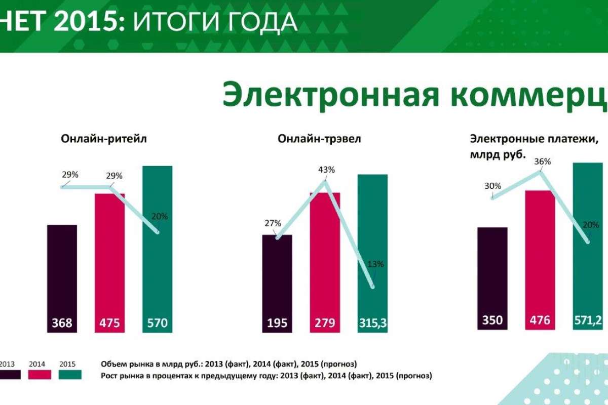 На диагр. 1 представлен один из слайдов презентации «РУНЕТ-2015: итоги года». Из него следует, что в нынешнем году в нашей стране сегмент «онлайн-ритейл» должен составить 570 млрд. руб., что на 20% выше аналогичного показателя 2014 г. (475 млрд. руб.). Последний, в свою очередь, был на 29% выше аналогичного показателя 2013 г. (368 млрд. руб.). То есть темпы роста российского «онлайн-ритейла» несколько замедлились. Но в то же время остались (в рублевом выражении) достаточно внушительными.