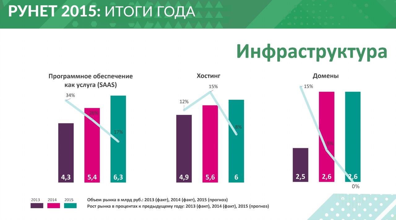 Неплохие результаты демонстрирует российский рынок SaaS. Предполагается (см. диагр. 3), что в этом году он достигнет 6,3 млрд. руб. Что на 17% лучше аналогичного показателя 2014 г. (5,4 млрд. руб.). Однако необходимо отметить, что аналогичный SaaS-показатель 2014 г. был лучше показателя 2013 г. на 26%, а SaaS-показатель 2013 г. был лучше показателя 2012 г. на 34%. То есть темпы роста этого рынка неуклонно падают.