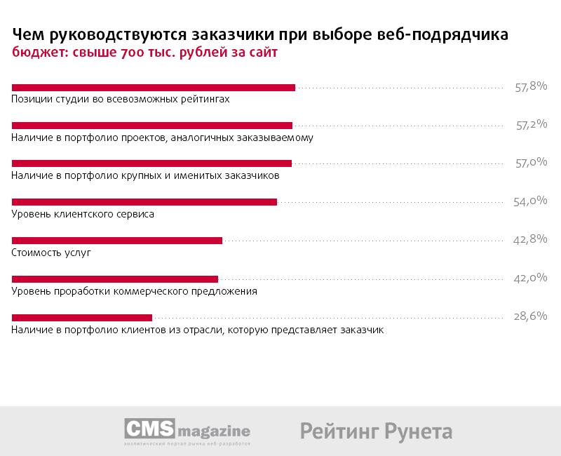 Закономерно, что представители компаний-клиентов с бюджетом на сайт свыше 700 тысяч рублей, гораздо более щепетильны и рассматривают большее количество критериев одновременно, при этом стоимость услуг здесь опускается на пятое место по важности:
