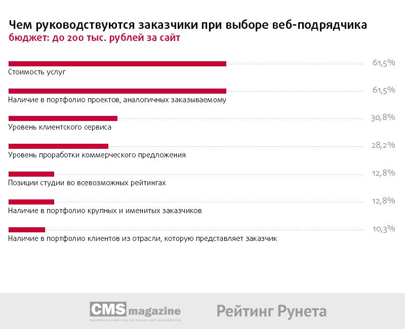 С другой стороны, что касается нижнего ценового сегмента (до 200 тысяч рублей за сайт), требований к подрядчикам здесь существенно меньше, а наибольшее значение имеет именно цена.