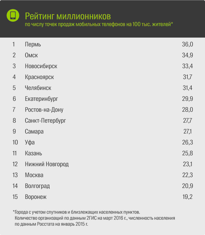 За год — с марта 2015 г. по март 2016 г. — количество точек продаж мобильных телефонов в миллионниках, по данным 2ГИС, увеличилось на 5%. Наибольший прирост был отмечен в Ростове-на-Дону (+25,3%), Нижнем Новгороде (+17,9%) и Самаре (+17,3%).