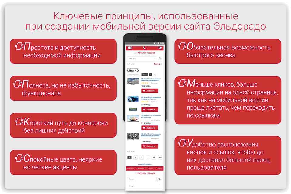 Запустив мобильную версию интернет-магазина, компания «Эльдорадо» тем самым создала положительный пользовательский опыт для мобильных устройств, повысив лояльность клиентов, мобильную конверсию и объем продаж через смартфоны.