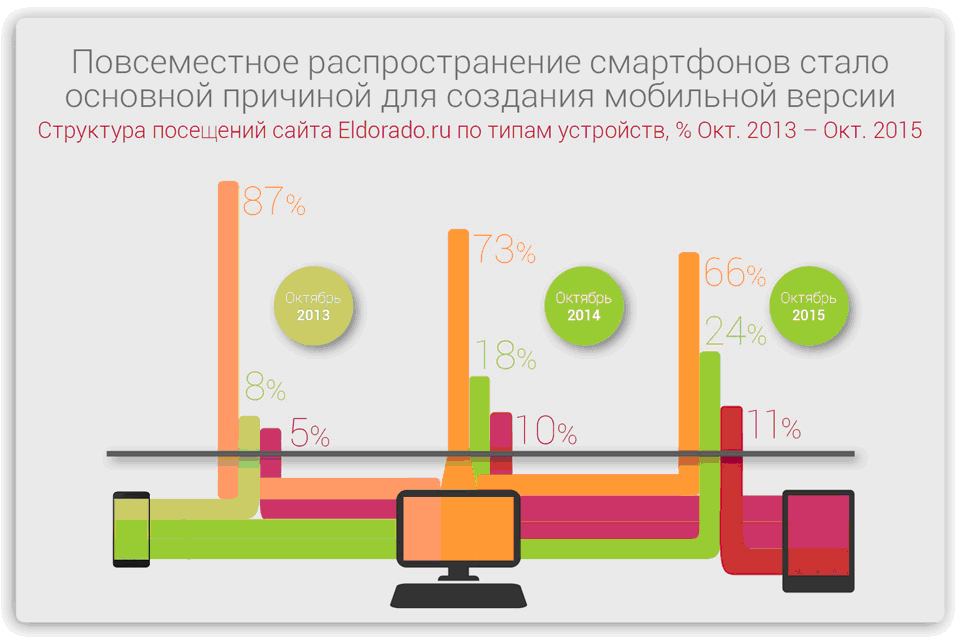 Сегодня, в условиях высокой конкуренции, как никогда важно говорить с пользователями на одном языке и понимать их поведение. «Мобильность» людей стремительно растет: по данным за 2015 года пользователями смартфонов стали 64% россиян. А среднее количество подключенных устройств на одного пользователя составляет 3 единицы. Анализ данных о трафике с различных устройств на сайт Eldorado.ru показал, что 24% запросов совершалось со смартфонов. Это значит, что каждый