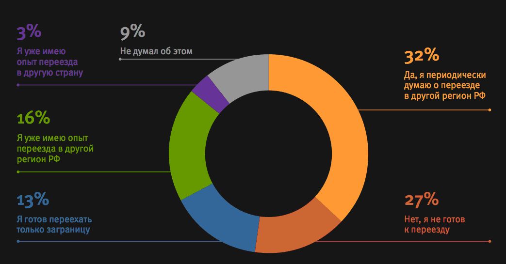 Наиболее предпочтительными субъектами для переезда стали: Москва (29,2%), Санкт-Петербург (27,7%) и Краснодарский край (11,3%). Также в ТОП-10 вошли Московская, Новосибирская, Нижегородская, Калининградская, Ленинградская, Самарская области и Республика Татарстан.