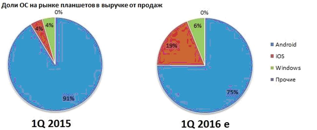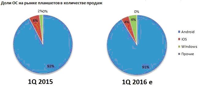 В количественном выражении доли планшетов на Android и iOS показали падение на 1 п.п. и по итогам 1 кв. 2016 года составили 91% и 4% соответственно в сравнении с 1 кв. 2015 года.