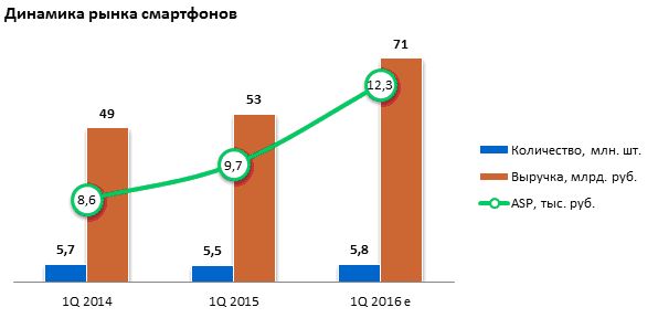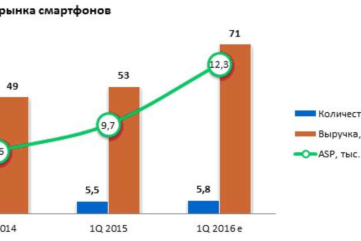 В 1 квартале 2016 года российский рынок смартфонов в количественном выражении вырос на 6% относительно аналогичного периода 2015 года. В денежном выражении продажи смартфонов продемонстрировали рост на 33%. Средняя цена смартфона выросла на 26% и составила 12 300 рублей. Годом ранее, в 1 квартале 2015 года по отношению к 1 кварталу 2014 года, рынок в денежном выражении показал рост меньше текущего года — на 9%, в количестве же произошло снижение продаж на 3%, средняя цена приросла на 13%.
