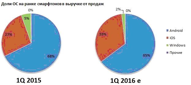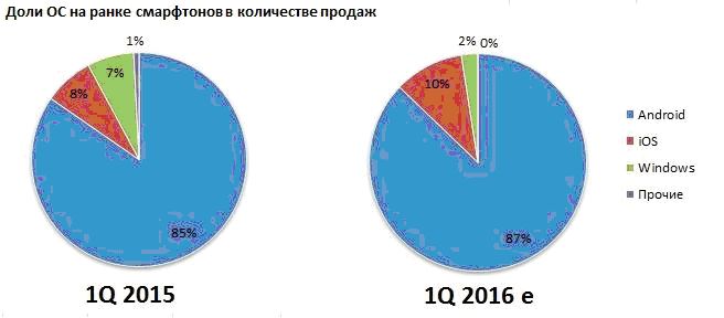 Доля смартфонов на iOS в натуральном выражении показала рост с 8% в 1 кв. 2015 года до 10% в 1 кв. 2016 года, в денежном — с 27% в 1 кв. 2015 года до 33% в 1 кв. 2016 года.