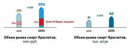 В упомянутом выше отчете также отмечается: «Одним из драйверов рынка БТиЭ в 2015 г. стали смартфоны. Эта категория продемонстрировала такой существенный рост, что вошла в список ключевых направлений для развития бизнеса „М.Видео“. Поэтому мы намерены в дальнейшем делать ставку на развитие продаж устройств и сервисов, которые тем или иным способом взаимодействуют между собой, образуя единую экосистему вокруг одного устройства — смартфона... В 2015 году рынок смартфонов достаточно устойчиво реагировал на экономический спад, показав незначительное снижение продаж в штуках и рост в денежном выражении на 9%». Руководитель департамента «Телеком» Сергей Сухоруков поясняет: «В данном сегменте рынке отчетливо заметен рост функциональности смартфонов в 2015 году в общих продажах смартфонов увеличилась доля устройств с поддержкой LTE и возможностью подключать две и более SIM-карты. Крупнейшим продавцом смартфонов в России в штучном выражении по итогам 2015 года стала компания Samsung. В число лидеров рынка вошли компании: Apple, Lenovo и Alcatel. В 2015 г. продажи смартфонов в „М.Видео“ увеличились на 7,5% в штуках и на 51% в деньгах... Сильным генератором выручки стали LTE-смартфоны — на них пришлось около половины от всего объема реализованных в сети смартфонов». Руководитель департамента «Аксессуары» Максим Гусев добавляет: «Параллельно с динамичным развитием рынка смартфонов происходит и активный рост рынка смарт-устройств, которые легко синхронизируются со смартфонами. Наиболее динамичная и популярная категория — смарт-браслеты и фитнес-трекеры. Их все чаще выбирают в качестве модных технологичных подарков. А растущее количество брендов-производителей, расширяющийся ассортимент этих гаджетов в России и улучшенный функционал способствуют такой тенденции».