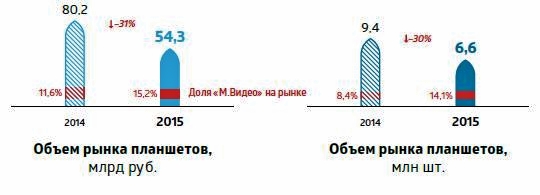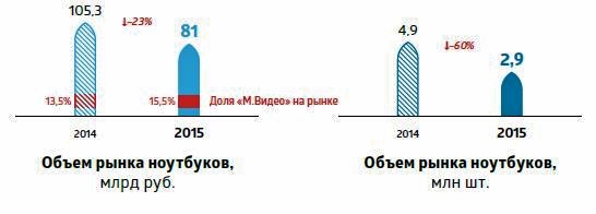 По данным, представленным в отчете, объем российского рынка бытовой техники и электроники в России в 2015 г. составил 1192 млрд руб., сократившись на 19,6% по сравнению с 2014 г. (1482,5 млрд руб.). Объем продаж «М.Видео» в 2015 г. — 191,9 млрд руб. Годом ранее — 203,1 млрд руб., т.е. падение составило 5,5%.