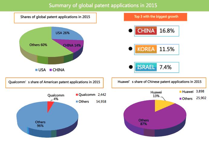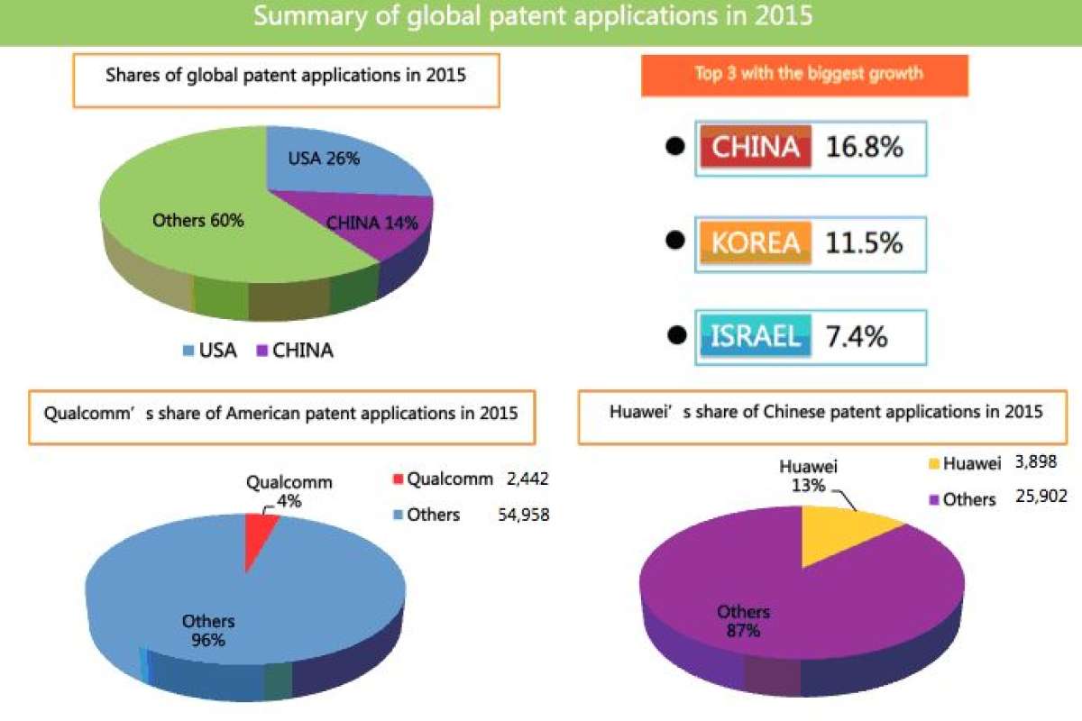 Huawei смогла продемонстрировать наилучшие показатели по количеству поданных патентных заявок. Она получила большое количество патентов не только в Китае, но также за пределами страны, что делает из нее крупного игрока, способного соревноваться с западными производителями мобильных устройств.