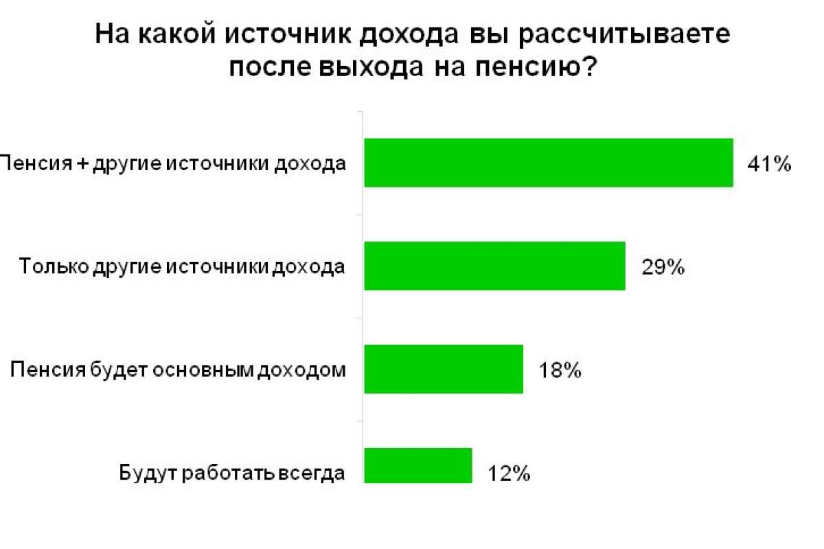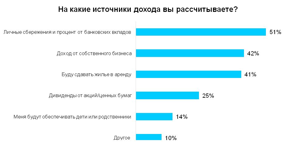 Другими источниками доходов в большинстве случаев оказались личные сбережения и проценты от банковских вкладов — их упомянули 51% респондентов. Многие также планируют в пенсионном возрасте получать доход от собственного бизнеса и от сдачи жилья в аренду. Четверть опрошенных заявили о том, что в старости будут жить на дивиденды от ценных бумаг, и лишь 14% указали, что в старости их будут полностью обеспечивать дети или другие родственники.