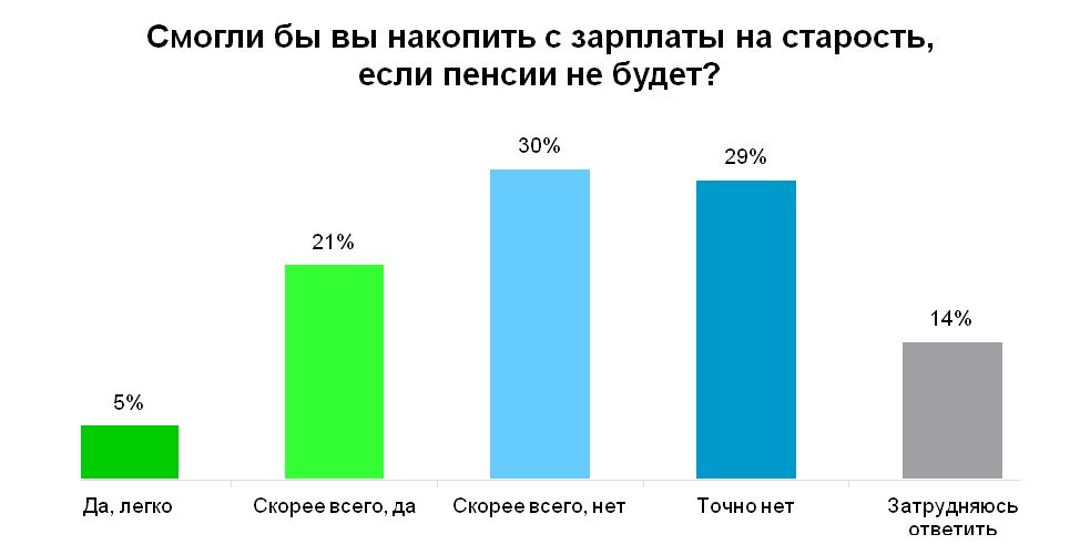 Если бы сейчас государство решило отказаться от пенсионной системы, и все пенсионные отчисления начали бы выплачиваться непосредственно с зарплатой, то большинство респондентов (63%) предпочло бы самостоятельно и целенаправленно делать сбережения «на старость». Лишь 16% ответили, что тратили бы эти деньги на повседневные нужды, а каждый пятый указал, что задачу по обеспечению себя пенсией он всё равно предпочёл бы делегировать государству.