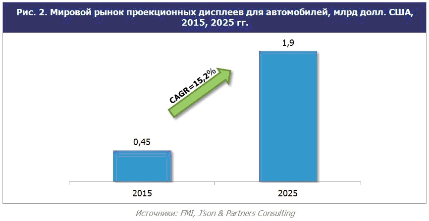 Мировой рынок проекционных дисплеев для автомобилей, согласно данным компании FMI, к 2025 году ожидает четырехкратный рост по сравнению с 2015 годом, со среднегодовым темпом роста в 15,2 %. К 2025 году объем рынка в денежном выражении может достигнуть 1,9 млрд долларов США. Наибольший рост при этом ожидается в Азиатско-Тихоокеанском регионе. Рост рынка станет возможен благодаря удобству системы и ее возможности повышать уровень безопасности на дороге, а также повышению уровня осведомленности конечных пользователей о существовании подобных систем. Кроме того, опорой для роста рынка станет увеличение доли автомобилей премиум- и люкс-класса на развивающихся рынках, таких как Китай и Индия, а также общий рост автомобильной промышленности в сочетании с повышением покупательной способности у потребителей.