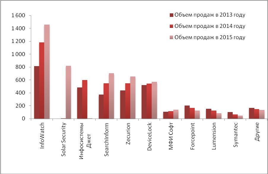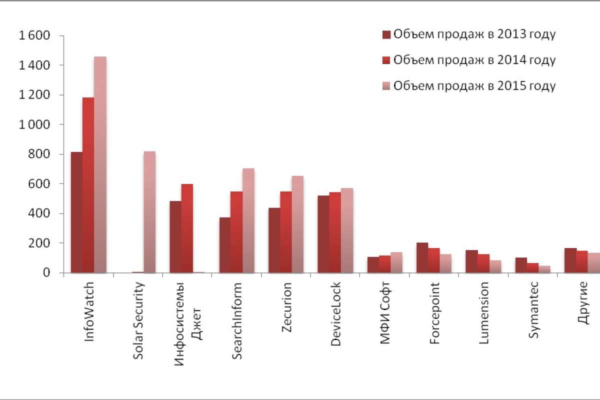 Тройка лидеров в 2014 и 2015 годах показала уверенный рост объемов продаж. Компания InfoWatch в 2015 году увеличила объем продаж на 23% в рублях, а годом ранее — на 45%. Продажи идущих следом компаний Solar Security и SearchInform в 2015 году выросли на 37% и 29% в рублях соответственно. Компании Zecurion, DeviceLock и МФИ Софт также увеличили объем продаж в рублях на 19%, 5% и 21% соответственно.