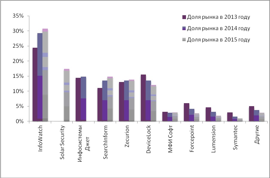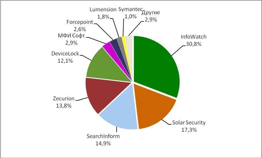 По объему продаж на российском рынке DLP в 2015 году лидируют российские производители: InfoWatch (1,46 млрд руб.), Solar Security (821 млн руб.) и SearchInform (703 млн руб.). За ними следуют компании Zecurion (652 млн руб.), DeviceLock (572 млн руб.) и МФИ Софт (139 млн руб.). Зарубежные производители Forcepoint (бывший Websense), Lumension и Symantec существенно ослабили свои позиции, уступая рынок российским конкурентам.