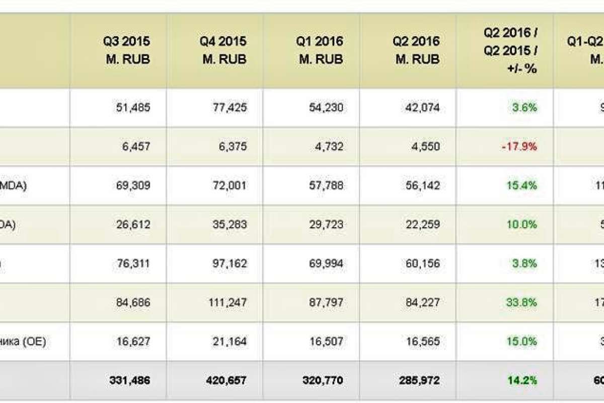 Согласно оценкам GfK, по итогам II квартала 2016 г. (Q2/2016) российский рынок бытовой техники и электроники (БТиЭ) увеличился, по сравнению с аналогичным периодом прошлого года на 14,2% (до 285,975 млрд. руб.). При этом (см. таблицу) свои результаты улучшили все сегменты данного рынка, за исключением сегмента фототехники, который, по сравнению с Q2/2015, просел на 17,9% (до 4,550 млрд. руб.).