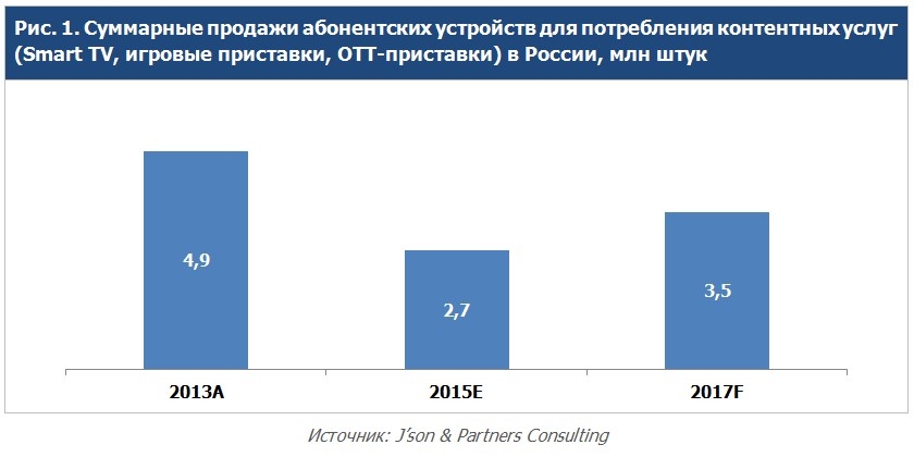 Важнейшей тенденцией последних лет стало увеличение числа устройств, предназначенных для потребления различных контентных услуг, в том числе SmartTV, медиаплееров, игровых приставок и других. Несмотря на падение продаж электроники в 2015 году, связанных со снижением реальных располагаемых доходов населения, их объемы составляют несколько миллионов устройств в год. По мнению J’son & Partners Consulting, по мере улучшения экономических условий в стране будет происходить ускоренное восстановление рынка устройств, и уже в 2017 году их продажи достигнут 3,5 млн шт.