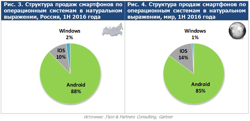 Структура рынка смартфонов по операционным системам схожа на российском и общемировом рынках. И там и там продолжается доминирование системы Android. Доля операционной системы от Google по итогам первого полугодия 2016 года составила 88 % на российском рынке и 85 % на общемировом рынке, от суммарных продаж смартфонов в натуральном выражении.