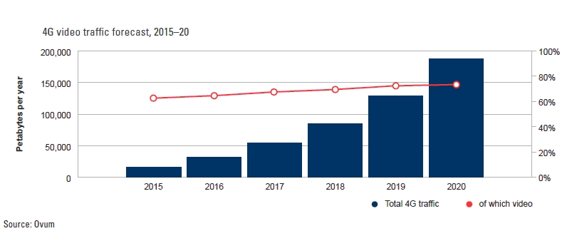 - К 2020 году доля мобильного видео в общем трафике 4G увеличится до 75% — в 2016 году она составляет лишь 15%. При этом рост будет идти в первую очередь за счет видео 4K UHD, видеороликов в социальных сетях и на мобильных устройствах, расширения сети 5G/FTTx и новейших тенденций в сфере IT (в том числе облачных вычислений, больших данных, телекоммуникационных ОС и т.д.).