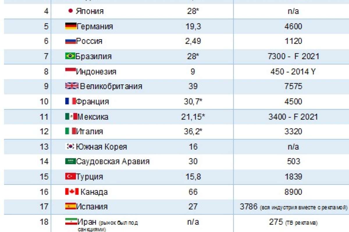 Единственная страна, показатель ARPU для которой не указан в таблице — Иран. До недавнего момента экономика страны находилась под влиянием санкций со стороны стран Запада, отчасти по этой причине рынок платного ТВ в данной стране пока слабо развит, хотя после отмены санкций к нему проявляют интерес крупные международные игроки. Все показатели в таблице переведены из национальных валют в доллары по курсу на 10.10.2016 г. Использованы данные аналитических компаний, местных телеком-регуляторов и собственные оценки TelecomDaily.