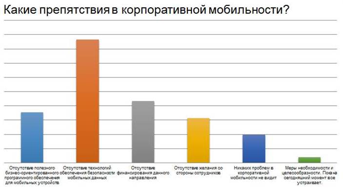 Однако подавляющее большинство респондентов на вопрос «Какие препятствия в корпоративной мобильности?» отметили отсутствие достаточного числа технологий обеспечения безопасности мобильных данных. ( рис 2)