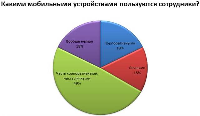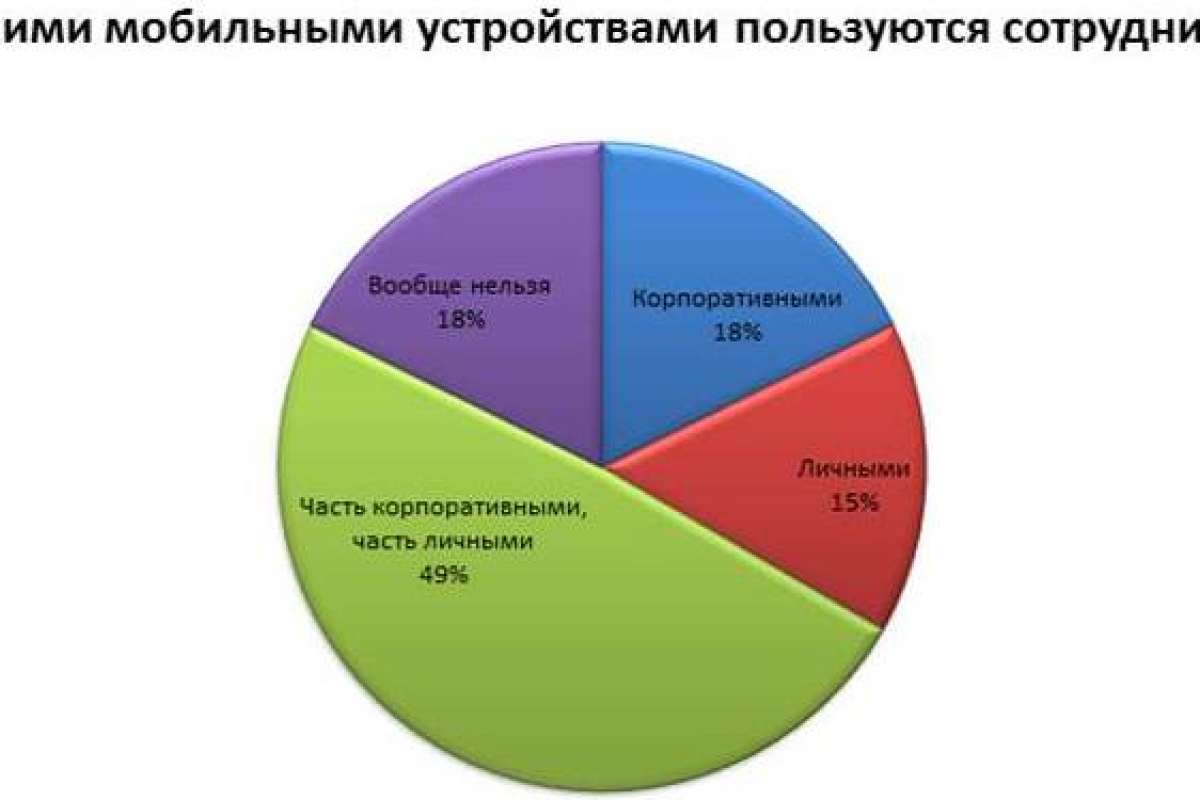 Личные устройства по модели BYOD используются в тех или иных пропорциях в 70% опрошенных компаний. ( рис 1) При этом только 20% -респондентов имеют стратегию перехода на корпоративную мобильность.