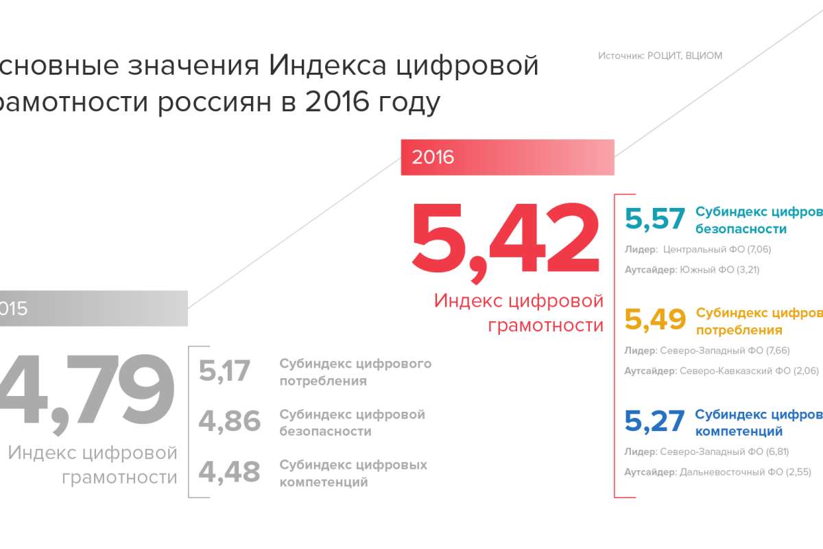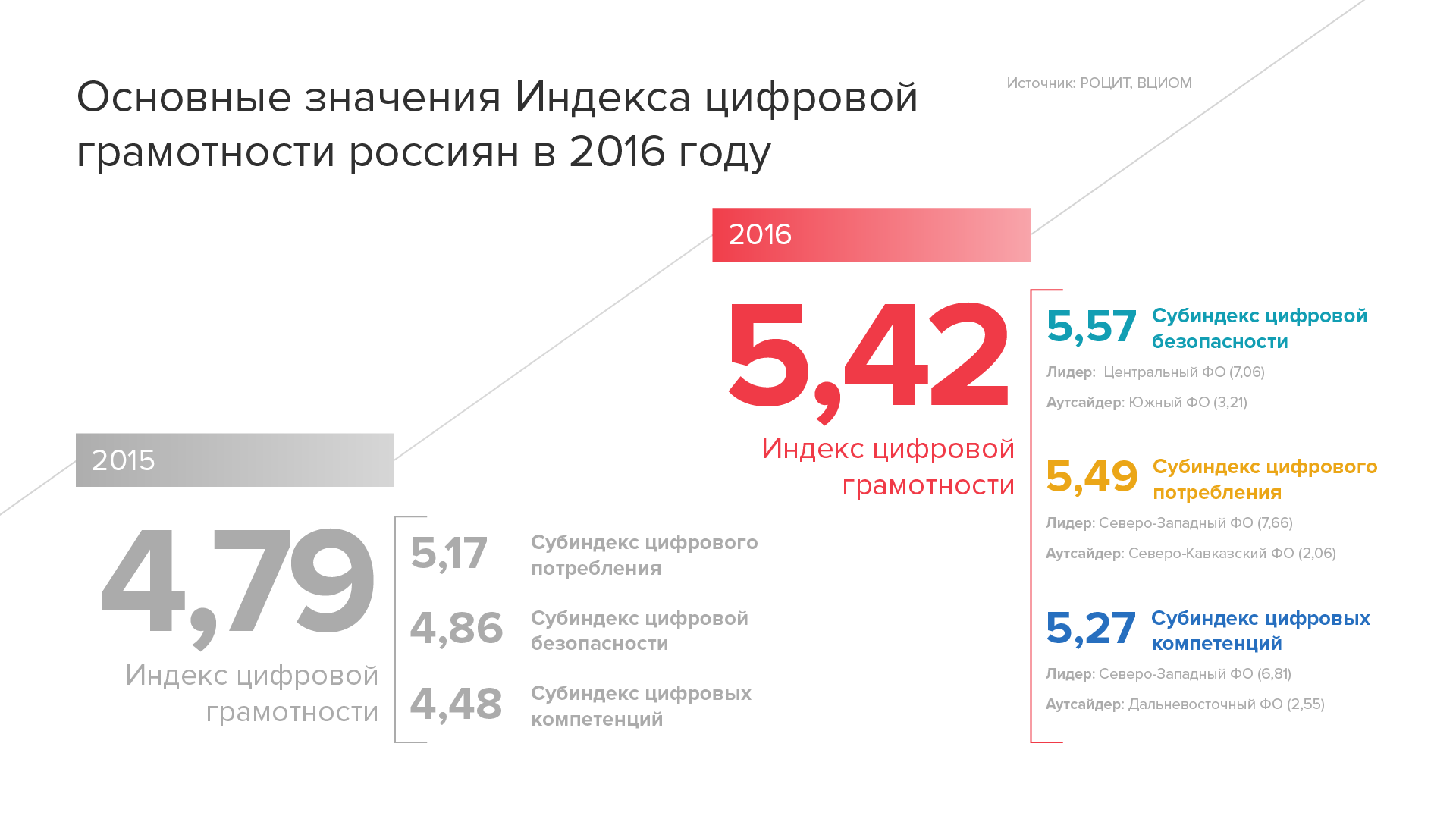 «В 2016 году РОЦИТ провел плодотворную работу по повышению цифровой грамотности россиян: проведена серия уроков для всех возрастных групп населения, выпущена серия информационно-просветительских материалов, а также заключен ряд соглашений о взаимодействии с администрациями регионов (Республика Дагестан, Воронежская область, Приморский край). В этом году нам удалось популяризовать проблему низкого уровня цифровой грамотности и привлечь к ее решению бизнес и государство. Главным достижением я считаю рост, продемонстрированный субиндексом цифровых компетенций. Его повышение объясняется расширением программ привлечения населения и его обучения, над которыми мы так старательно работали», — отмечает Сергей Гребенников, Директор РОЦИТ.