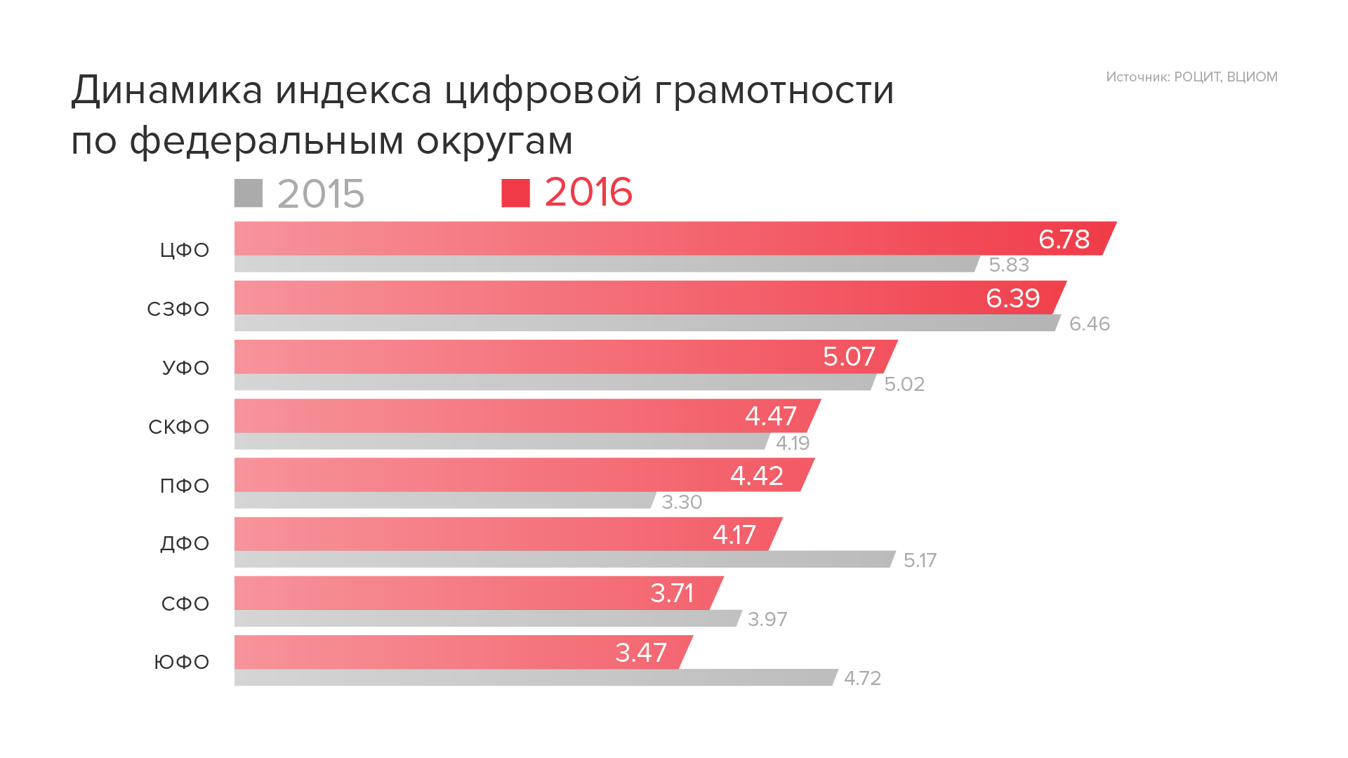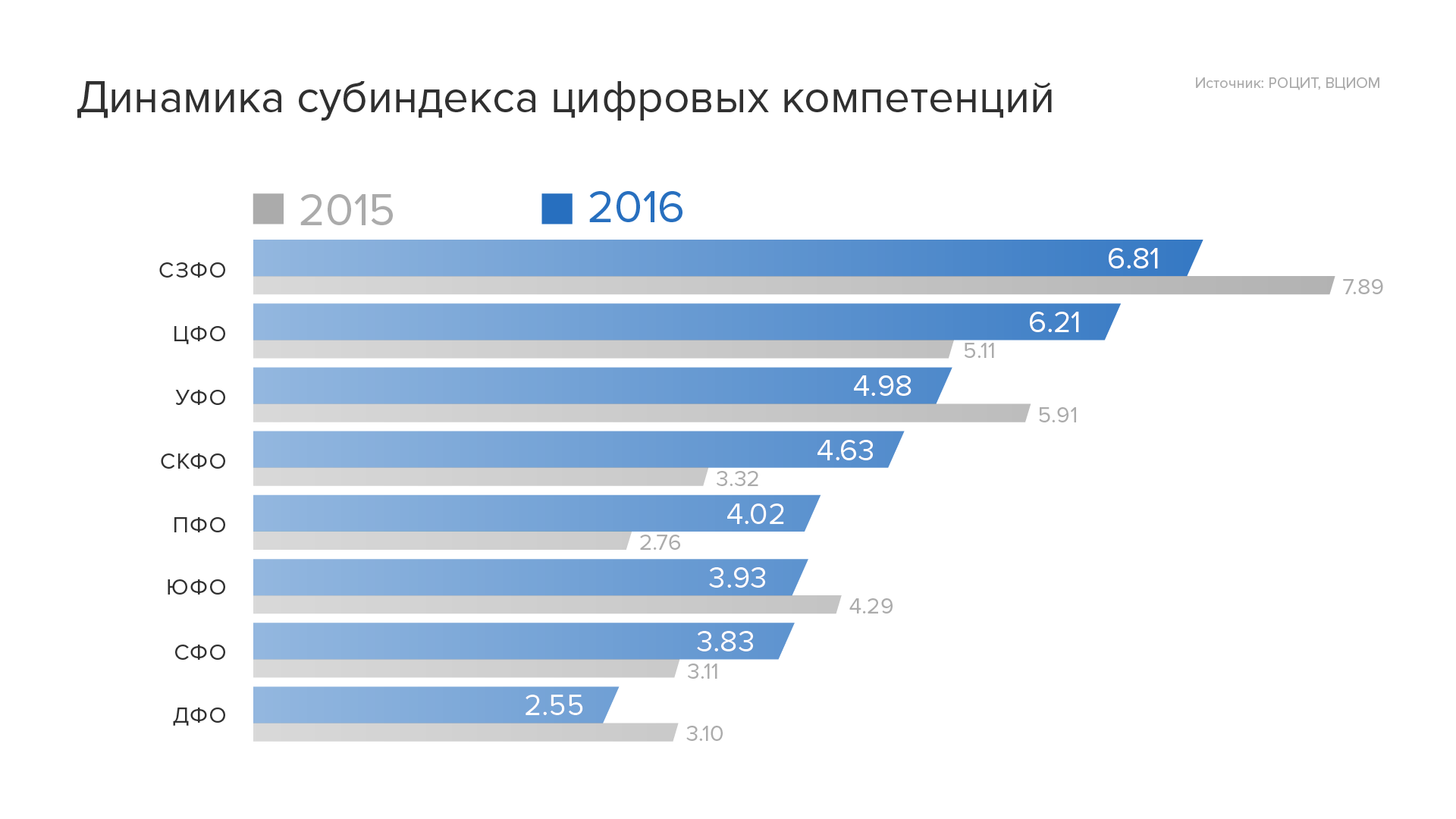 За 2016 год произошла смена лидера Индекса, теперь это Центральный ФО, который значительно вырос, почти на 10%, что и позволило ему уверенно занять первое место, потеснив конкурента. Северо-Западный ФО сместился на второе место, уступив позиции за счет снижения показателя цифровых компетенций. Одновременно, значение субиндекса цифровой безопасности заметно повысилось, в прошлом году это было болевой точкой региона, сейчас данный субиндекс уже не находится в аутсайдерах, что позволяет достичь гармоничности развития цифровой грамотности в регионе в целом. Третье место занимает Уральский ФО, который продемонстрировал стабильность, его значения практически не изменились, что говорит о сравнительной устойчивости в соотношении с другими регионами.